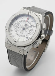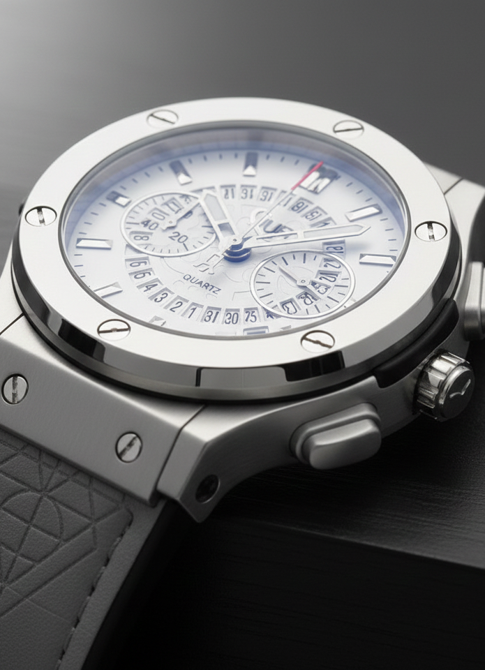 This luxury men’s wrist watch is designed for those who value style and performance. The watch features a bold silver dial with chronograph sub-dials and a durable grey strap for all-day comfort. Its quartz movement ensures accurate timekeeping, while the modern design makes it suitable for both casual and formal outfits.