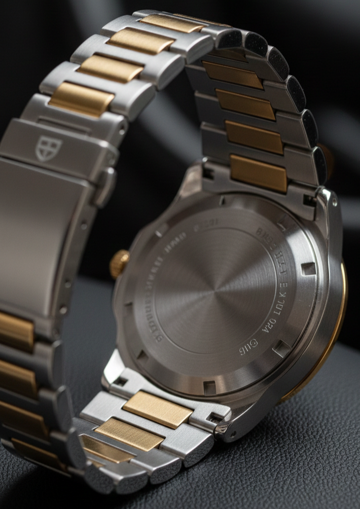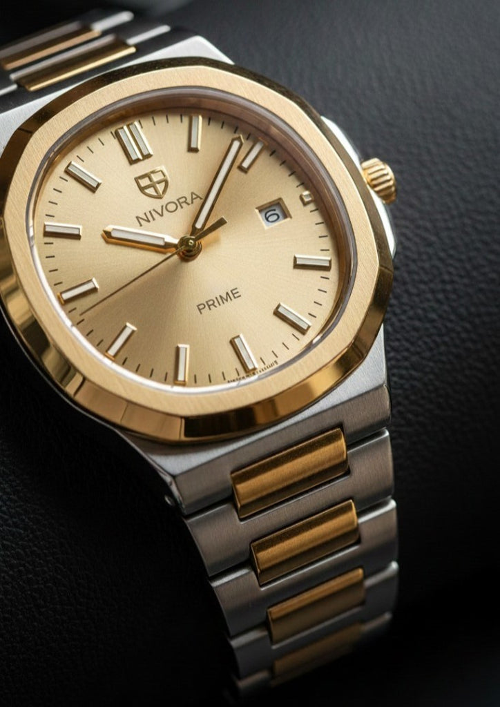 The Nivora Prime™ Two-Tone Luxury Watch blends classic elegance with modern craftsmanship. Featuring a refined gold-tone dial, a gold & silver stainless steel bracelet, and a date display, this watch delivers a prestigious look inspired by iconic luxury designs.