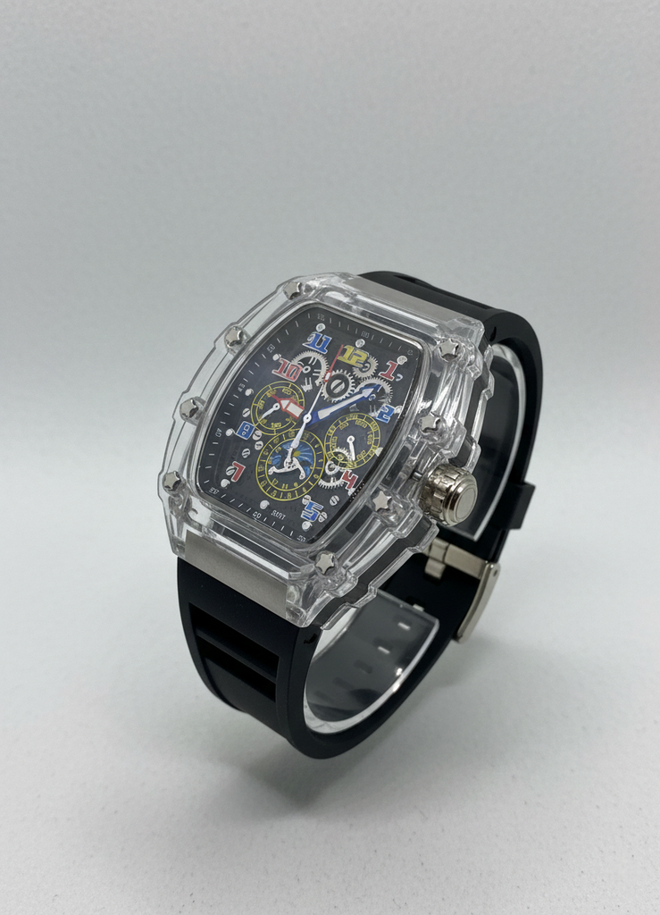 The Nivora Prime™ Transparent Skeleton Watch is crafted for men who don’t follow trends — they create them. Featuring a striking skeleton dial, crystal-clear transparent case, and a premium black silicone strap, this watch delivers a bold, high-end look inspired by elite luxury timepieces.
